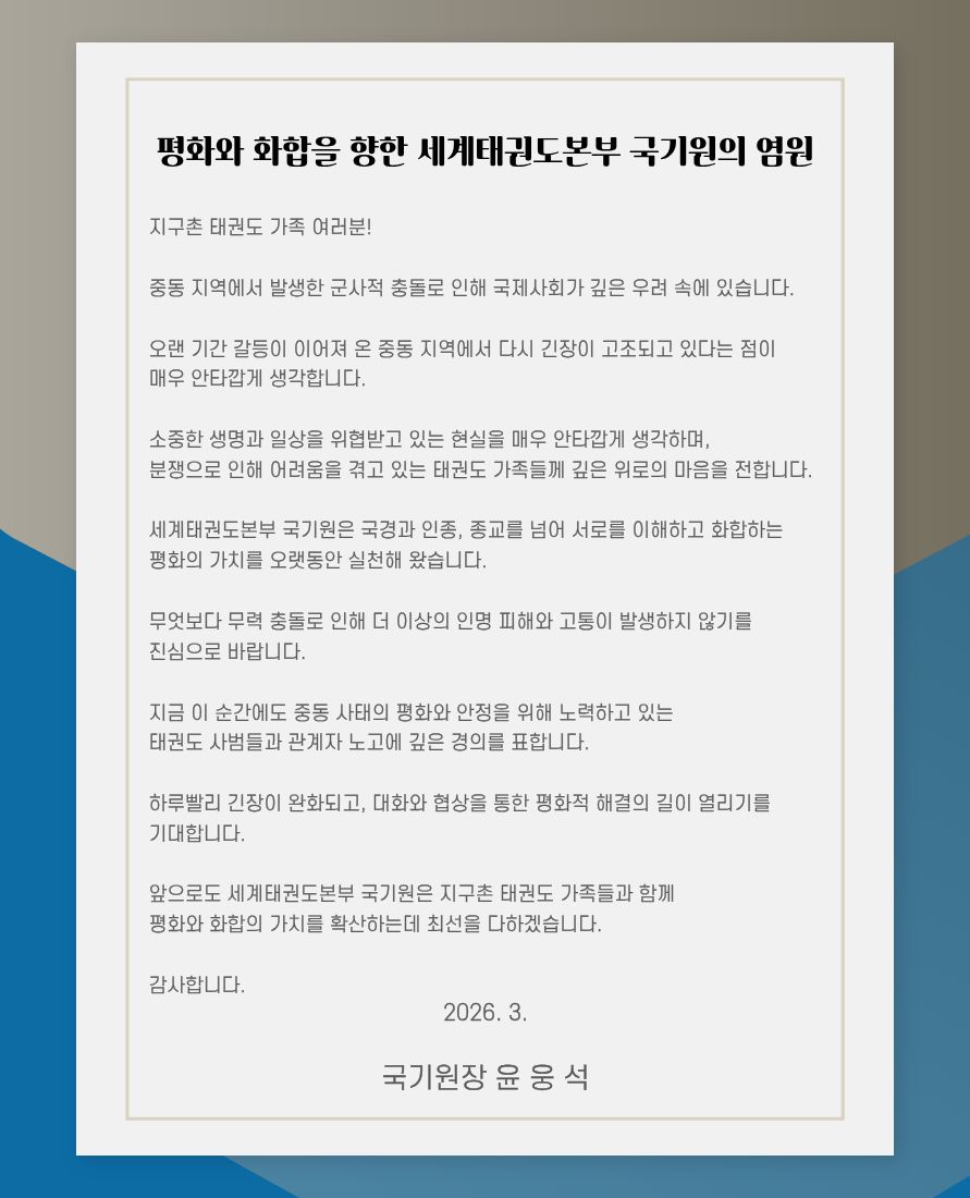 NEW 국기원의 새로운 소식을 전해드립니다. 공지사항 보도자료 채용공고 공지사항 VIEW MORE 이전 슬라이드 슬라이드 정지 슬라이드 재생 다음 슬라이드 국기원 휴무 안내 - 공지사항 2026.02.26 VIEW MORE 『2026 주한외국인 태권도 보급』사업 태권도 교육 사범(학교 및 센터) 신규 선발 공고 - 공지사항 2026.02.20 VIEW MORE 국기원 설 연휴 단축근무 안내 - 공지사항 2026.02.11 VIEW MORE 『2026 주한외국인 태권도 보급』사업 태권도 교육 사범(주한미군) 신규 선발 공고 - 공지사항 2026.02.02 VIEW MORE 국기원 태권도연구소 신임 소장에 임태희 교수 위촉 - 보도자료 2026.03.17 VIEW MORE 국기원, 태권도 9단 수여식 예복 폐지…태권도복 전면 도입 - 보도자료 2026.03.16 VIEW MORE 국기원,‘태권도장 지원 사업 TF팀’구성…본격 활동 - 보도자료 2026.03.10 VIEW MORE 국기원, 해외 파견사범 보수교육 돌입 - 보도자료 2026.03.10 VIEW MORE 비정규직 촉탁직원(기금정책팀) 채용 공고 - 채용공고 2026.04.03 VIEW MORE 비정규직 촉탁직원(연수진흥팀) 채용 공고 [마감] - 채용공고 2026.02.11 VIEW MORE 국기원 태권도시범단 ‘2026년 상근 단원 선발’ 절차 개시 안내 - 채용공고 2026.01.15 VIEW MORE 국기원 태권도시범단 ‘2026년 상근 단원 선발’ 일정 변경 안내 - 채용공고 2025.12.02 VIEW MORE