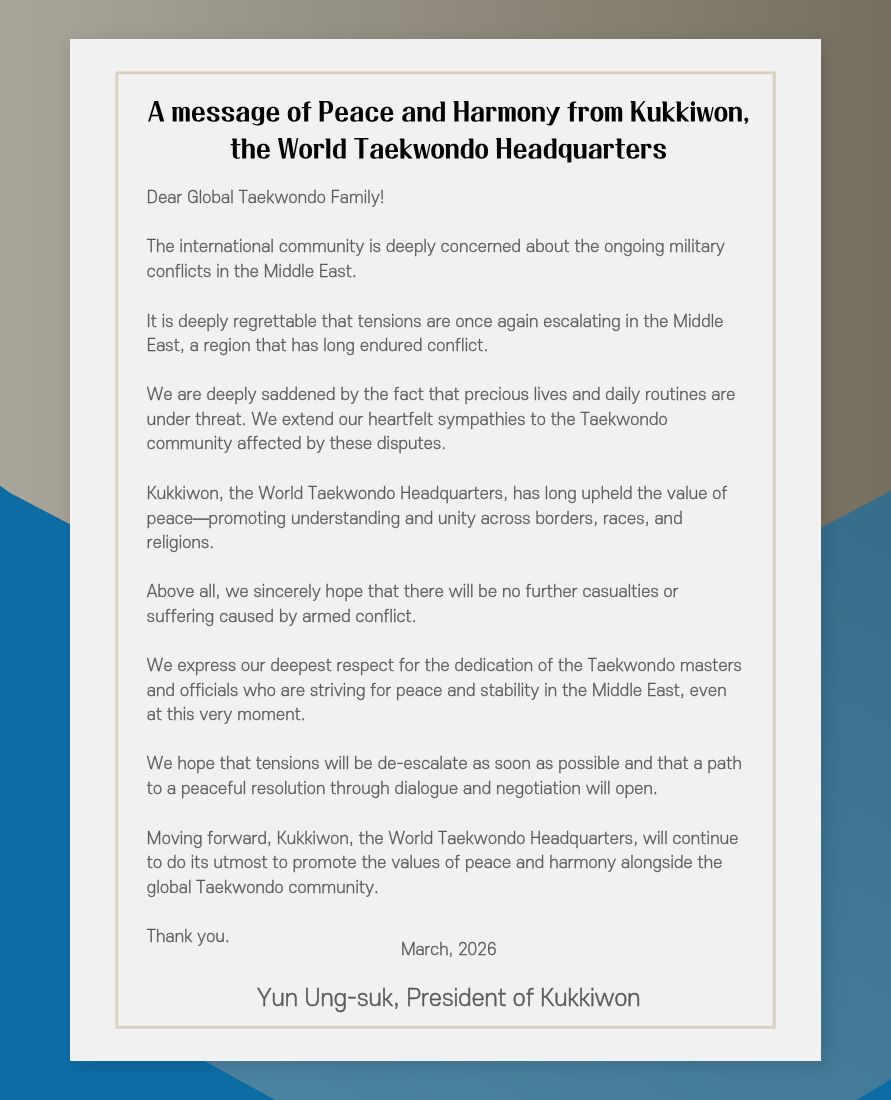 Kukkiwon is a place where Taekwondo plays a useful role and function in promoting Korea and maintaining peace and well-being of people around the world We will create a world where we can all enjoy together so that we can continue to be sincere We will continue our globalization activities.